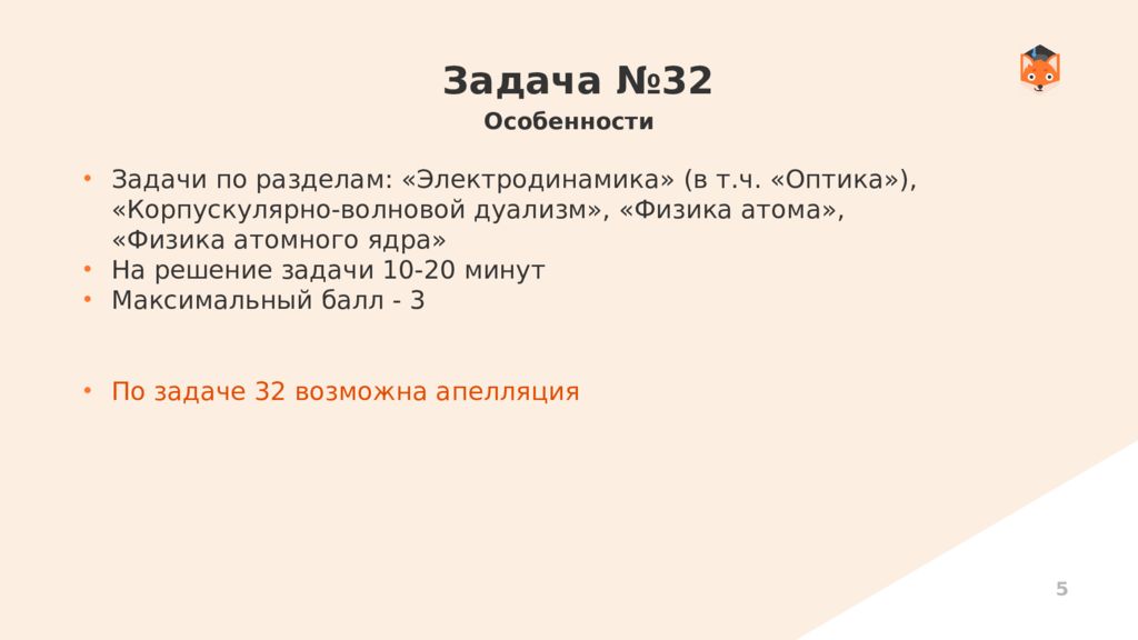5 Особенности Задача №32 Задачи по разделам: «Электродинамика» (в т.ч. «Оптика»), «Корпускулярно-волновой дуализм», «Физика атома», «Физика атомного ядра» На решение задачи 10-20 минут Максимальный балл - 3 П о задаче 32 возможна апелляция