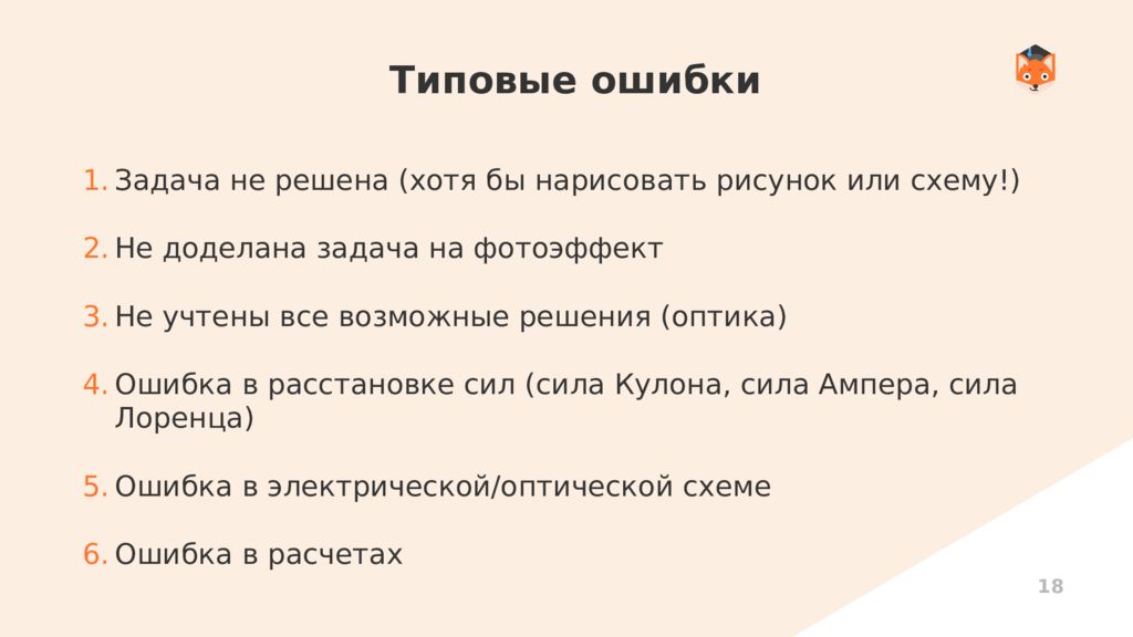 18 Типовые ошибки Задача не решена (хотя бы нарисовать рисунок или схему!) Не доделана задача на фотоэффект Не учтены все возможные решения (оптика) Ошибка в расстановке сил (сила Кулона, сила Ампера, сила Лоренца) Ошибка в электрической/оптической схеме Ошибка в расчетах