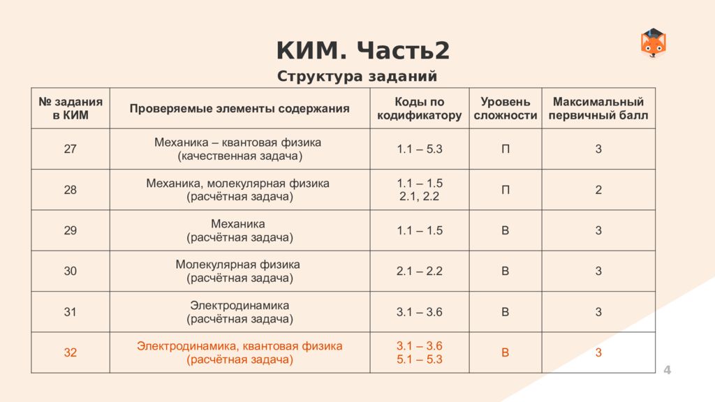 4 Структура заданий КИМ. Часть2 № задания в КИМ Проверяемые элементы содержания Коды по кодификатору Уровень сложности Максимальный первичный балл 27 Механика – квантовая физика (качественная задача) 1.1 – 5.3 П 3 28 Механика, молекулярная физика (расчётная задача) 1.1 – 1.5 2.1, 2.2 П 2 29 Механика (расчётная задача) 1.1 – 1.5 В 3 30 Молекулярная физика (расчётная задача) 2.1 – 2.2 В 3 31 Электродинамика (расчётная задача) 3.1 – 3.6 В 3 32 Электродинамика, квантовая физика (расчётная задача) 3.1 – 3.6 5.1 – 5.3 В 3