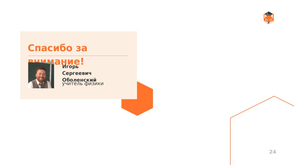 23 Приложение 3. Основные ошибки. ЭП и МП Перепутал формулы (Закон Ома, послед. и парал. соединение, ёмкость конденсатора) Перепутал Вольты и Ватты Ошибки при рисовании/преобразовании электрической схемы Не смог рассчитать параметры ( U,I,R ) для смешанного соединения Не умеет решать задачи с конденсатором Складывает электрические поля скалярно (силы и напряженности) Не умеет рассчитывать мощность при параллельном и последовательном соединении Использование запрещенных формул (правила Кирхгофа) Сложности с последовательным применением правого/левого винта, правила Ленца Перепутал левый/правый винт для определения направления силы или поля Ошибки в задачах на синус/косинус, опережение/отставание напряжения/тока по фазе (редко бывают в КИМах) Забыл шкалу ЭМВ Не знаком с внешним видом и названием оборудования (задачи на погрешности, качественные задачи)