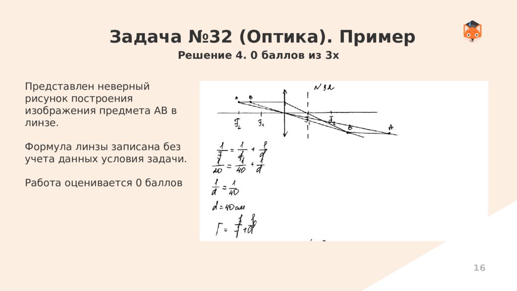 16 Решение 4. 0 баллов из 3х Задача №32 (Оптика). Пример Представлен неверный рисунок построения изображения предмета АВ в линзе. Формула линзы записана без учета данных условия задачи. Работа оценивается 0 баллов