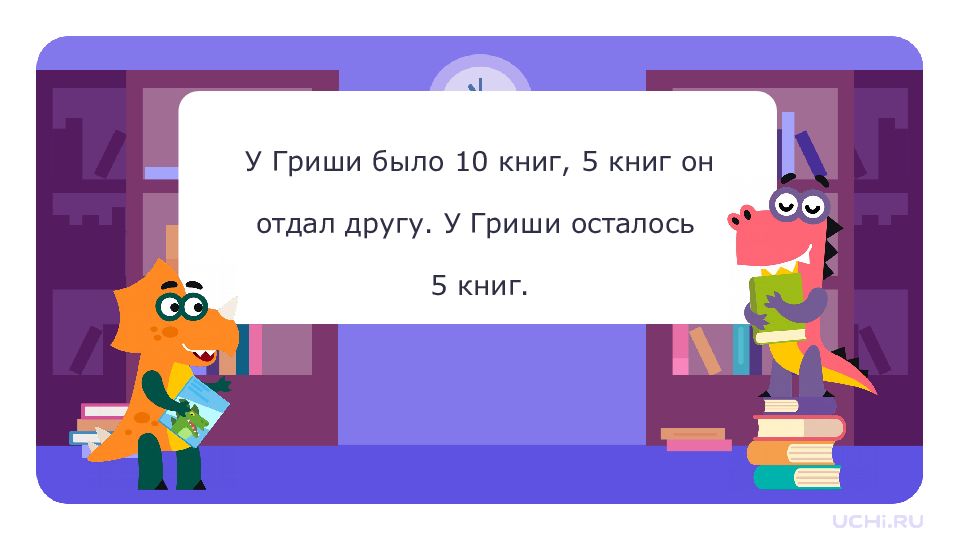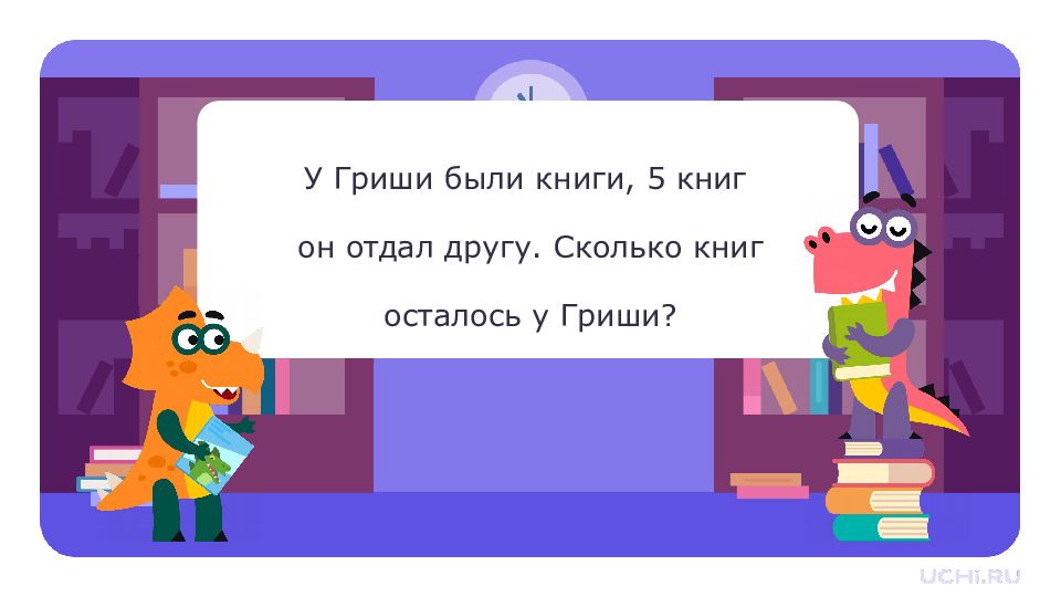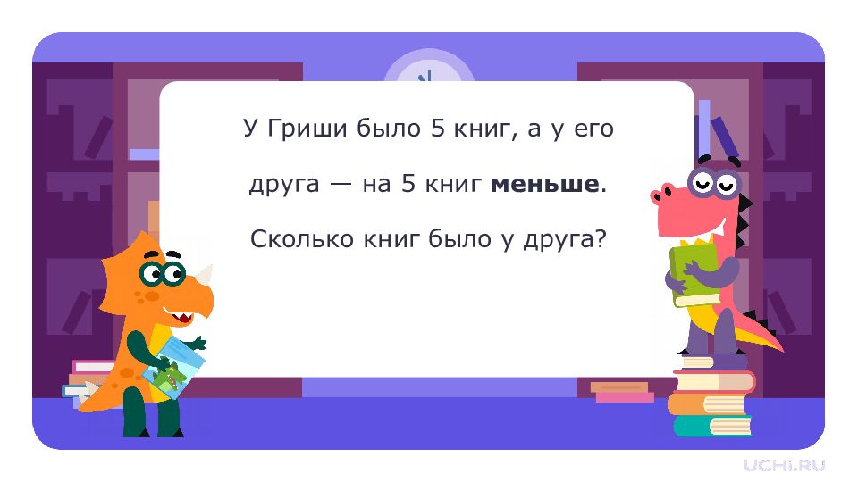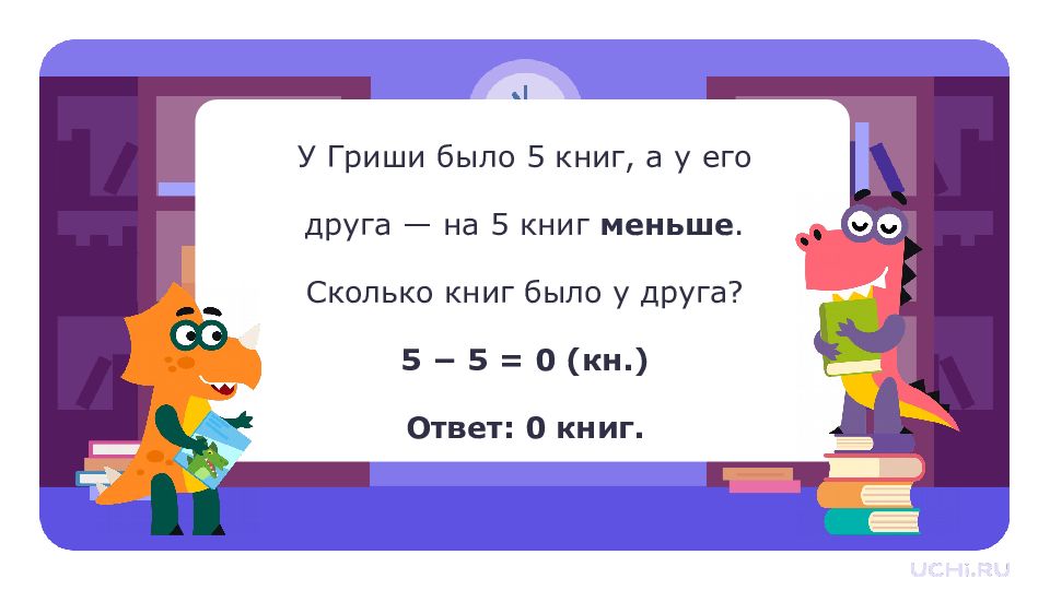 У Гриши было 5 книг, а у его друга — на 5 книг меньше. Сколько книг было у друга? 5 − 5 = 0 (кн.) Ответ: 0 книг.