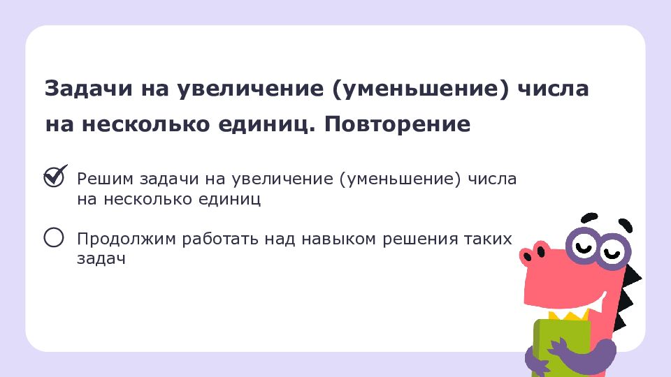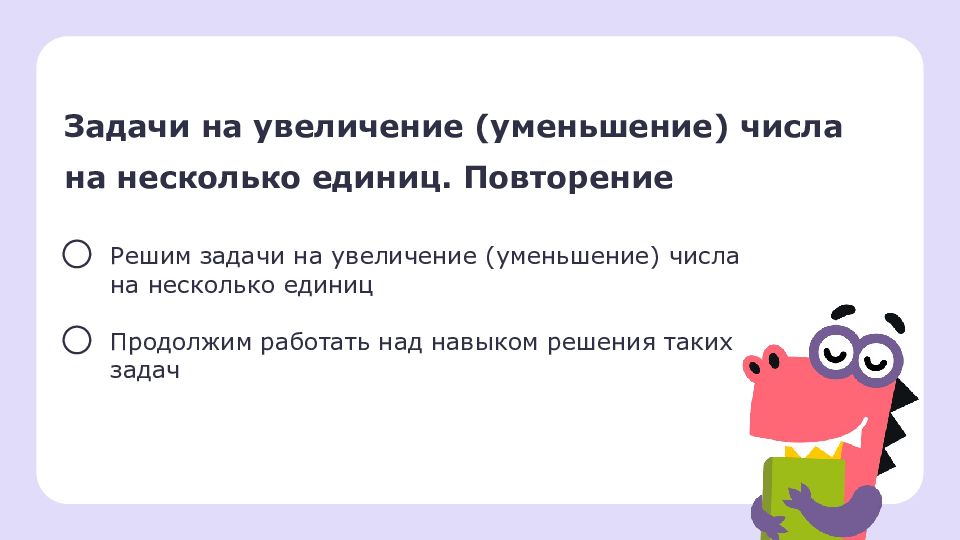 Задачи на увеличение (уменьшение) числа на несколько единиц. Повторение Решим задачи на увеличение (уменьшение) числа на несколько единиц Продолжим работать над навыком решения таких задач