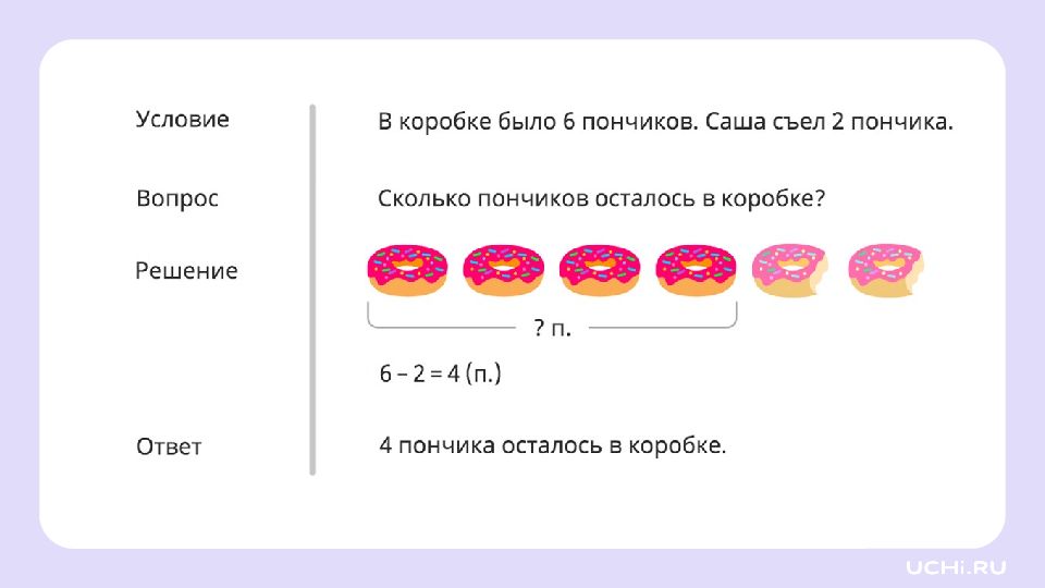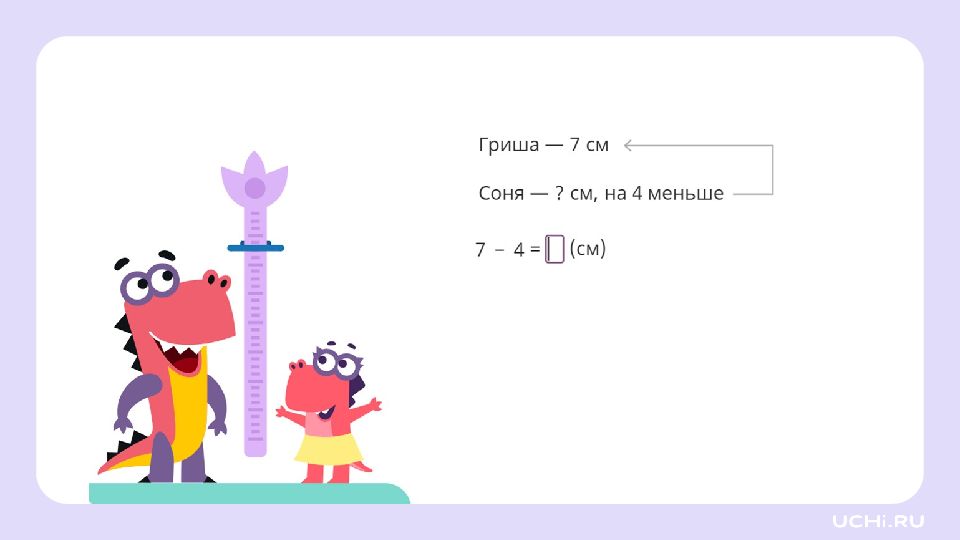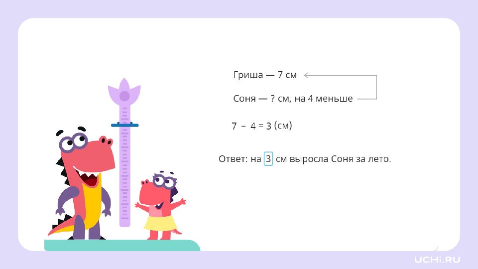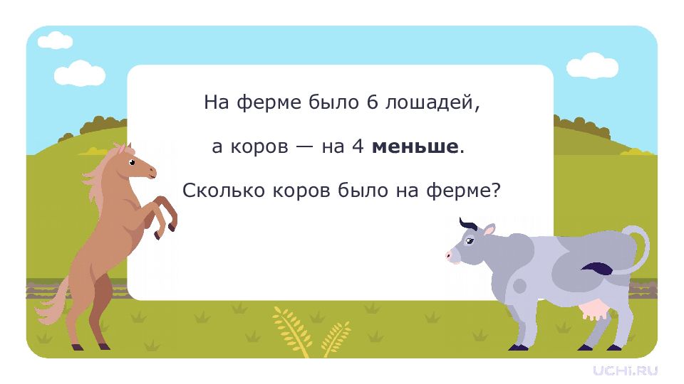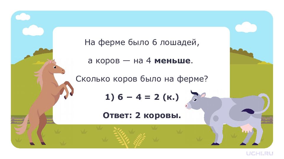 На ферме было 6 лошадей, а коров — на 4 меньше. Сколько коров было на ферме? 1) 6 − 4 = 2 (к.) Ответ: 2 коровы.