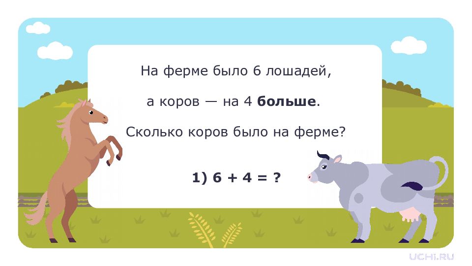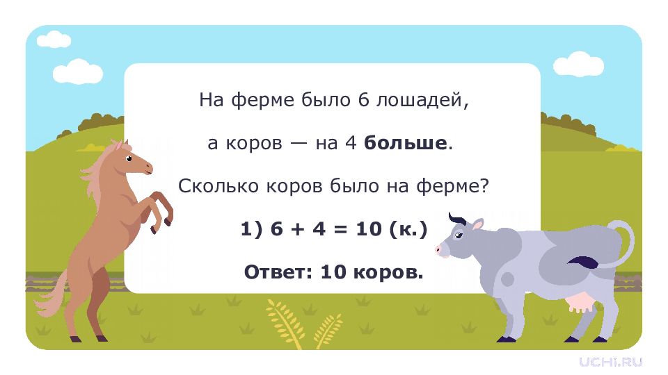 На ферме было 6 лошадей, а коров — на 4 больше. Сколько коров было на ферме? 1) 6 + 4 = 10 (к.) Ответ: 10 коров.