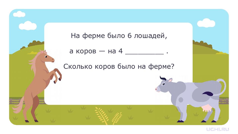 На ферме было 6 лошадей, а коров — на 4 _________. Сколько коров было на ферме?