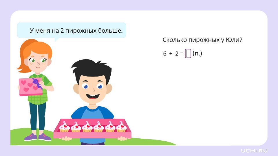 На ферме было 6 лошадей, а коров — на 4 больше. Сколько коров было на ферме? 1) 6 + 4 = 10 (к.)