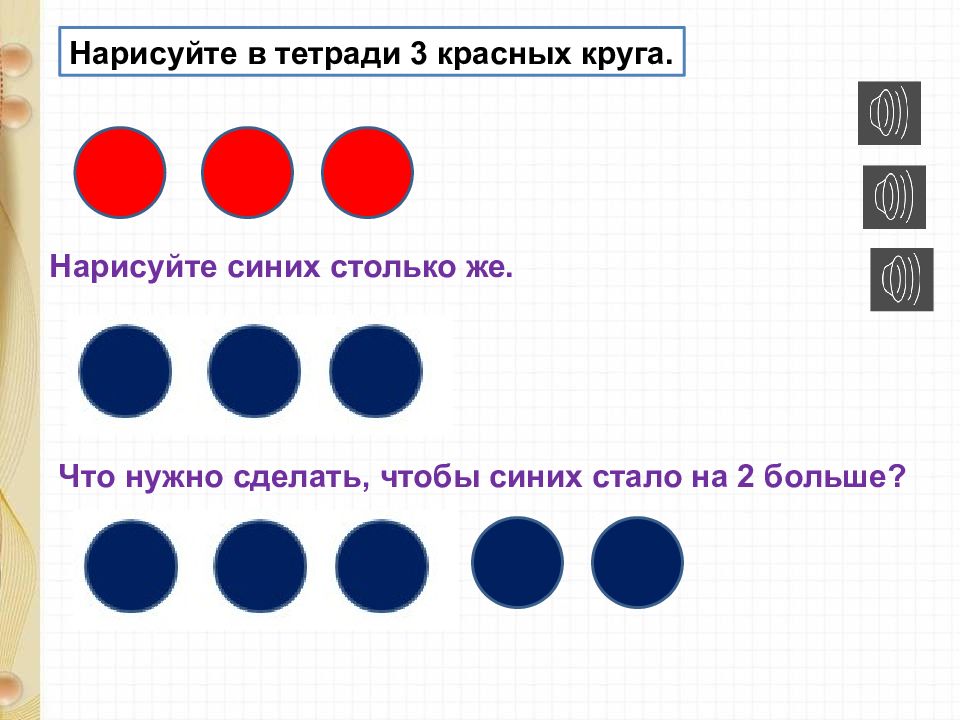 Нарисуйте в тетради 3 красных круга. Нарисуйте синих столько же. Что нужно сделать, чтобы синих стало на 2 больше?