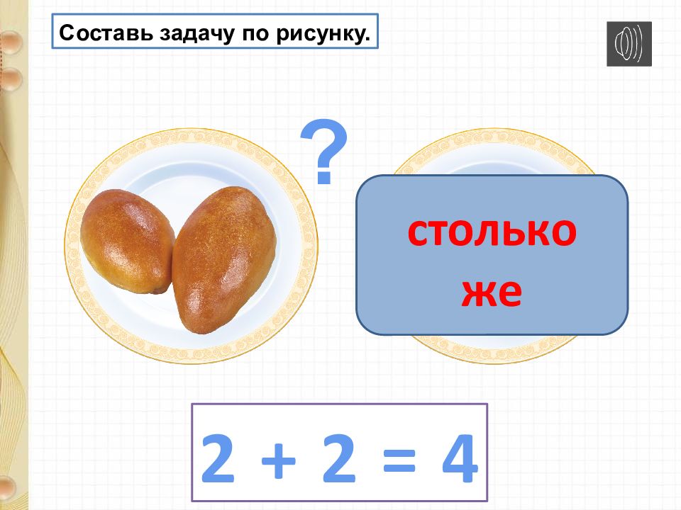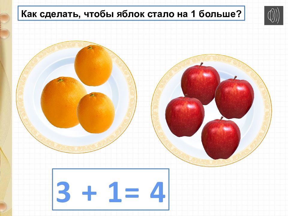 Составь задачи по картинке на + -. 3 + 1= 4 3 + 1 = 4 4 – 1 = 3 4 – 3 = 1