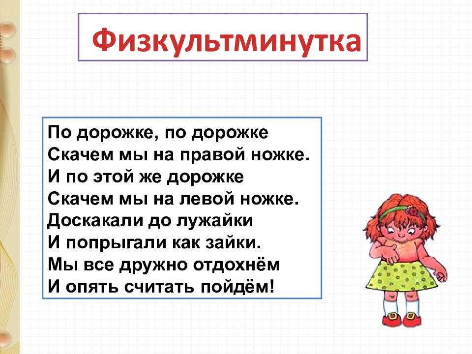 По дорожке, по дорожке Скачем мы на правой ножке. И по этой же дорожке Скачем мы на левой ножке. Доскакали до лужайки И попрыгали как зайки. Мы все дружно отдохнём И опять считать пойдём! Физкультминутка