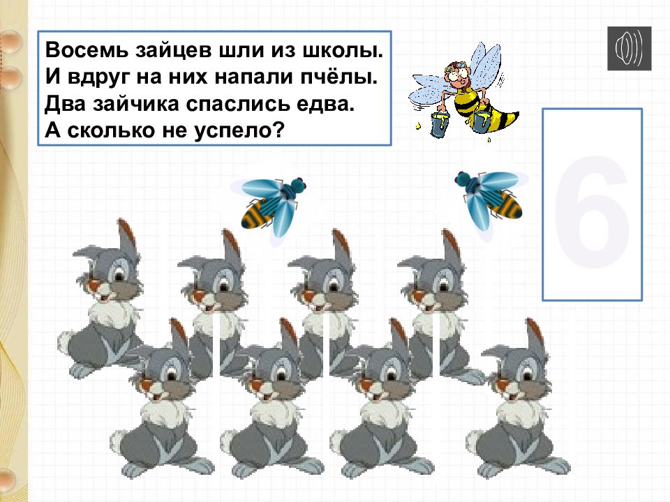 Восемь зайцев шли из школы. И вдруг на них напали пчёлы. Два зайчика спаслись едва. А сколько не успело? 6