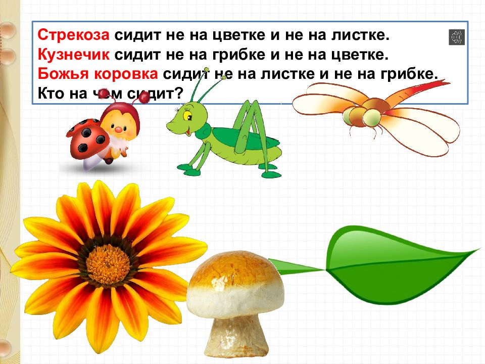 Стрекоза сидит не на цветке и не на листке. Кузнечик сидит не на грибке и не на цветке. Божья коровка сидит не на листке и не на грибке. Кто на чем сидит?