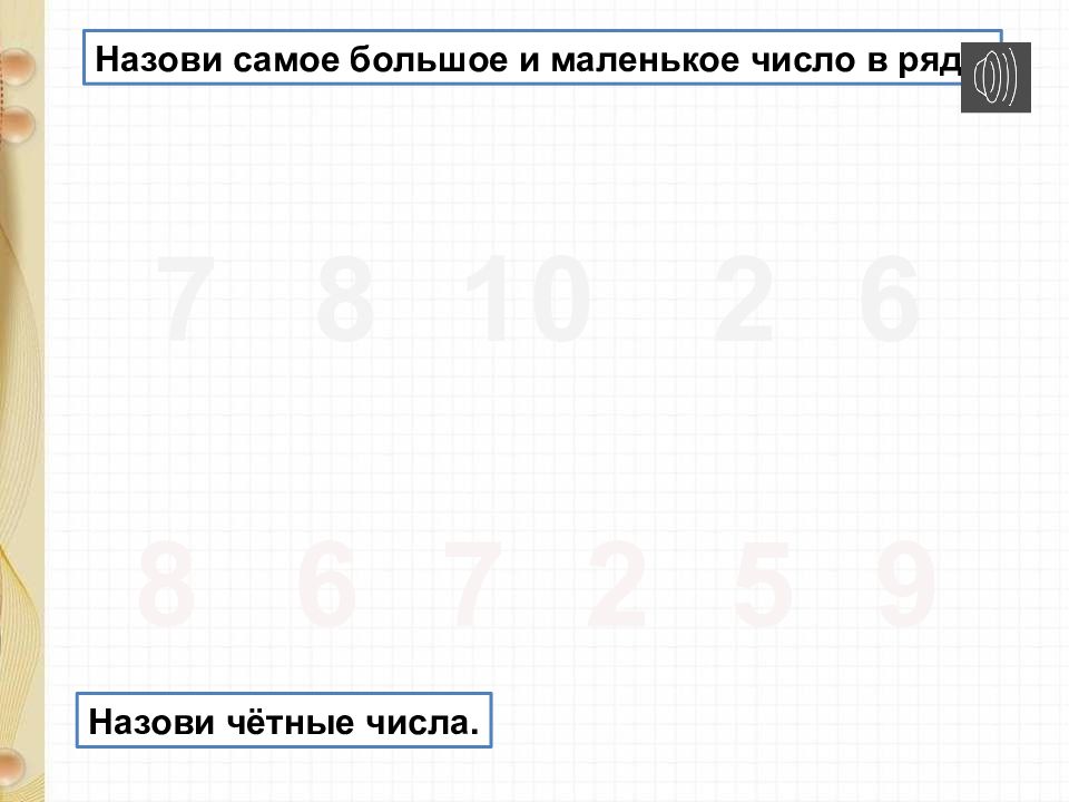 Назови самое большое и маленькое число в ряду. 8 10 2 6 6 7 2 5 9 Назови чётные числа.