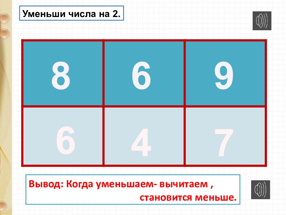 8 6 9 6 4 7 Уменьши числа на 2. Вывод: Когда уменьшаем- вычитаем, становится меньше.