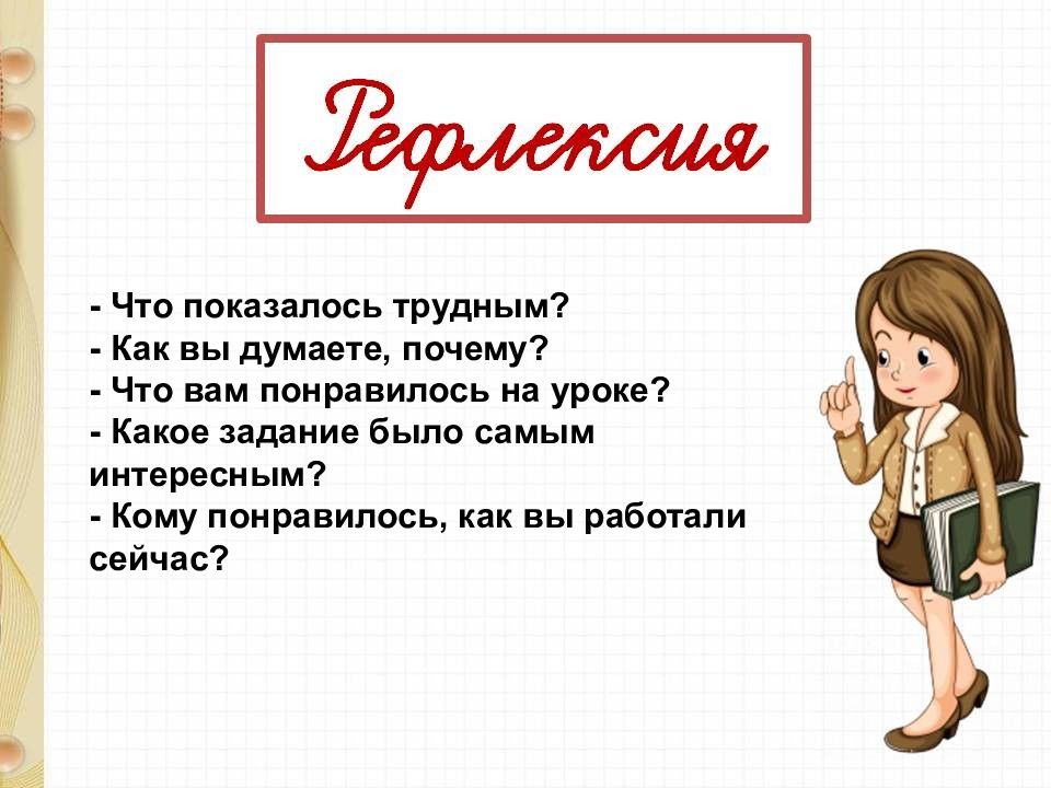 - Что показалось трудным? - Как вы думаете, почему? - Что вам понравилось на уроке? - Какое задание было самым интересным? - Кому понравилось, как вы работали сейчас?