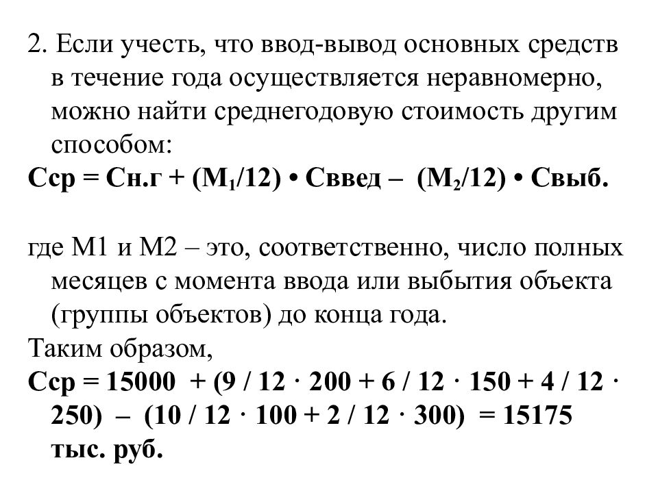 2. Если учесть, что ввод-вывод основных средств в течение года осуществляется неравномерно, можно найти среднегодовую стоимость другим способом: Сср = Сн.г + (М 1 /12) • Сввед – (М 2 /12) • Свыб. где М1 и М2 – это, соответственно, число полных месяцев с момента ввода или выбытия объекта (группы объектов) до конца года. Таким образом, Сср = 15000 + (9 / 12 · 200 + 6 / 12 · 150 + 4 / 12 · 250) – (10 / 12 · 100 + 2 / 12 · 300) = 15175 тыс. руб.