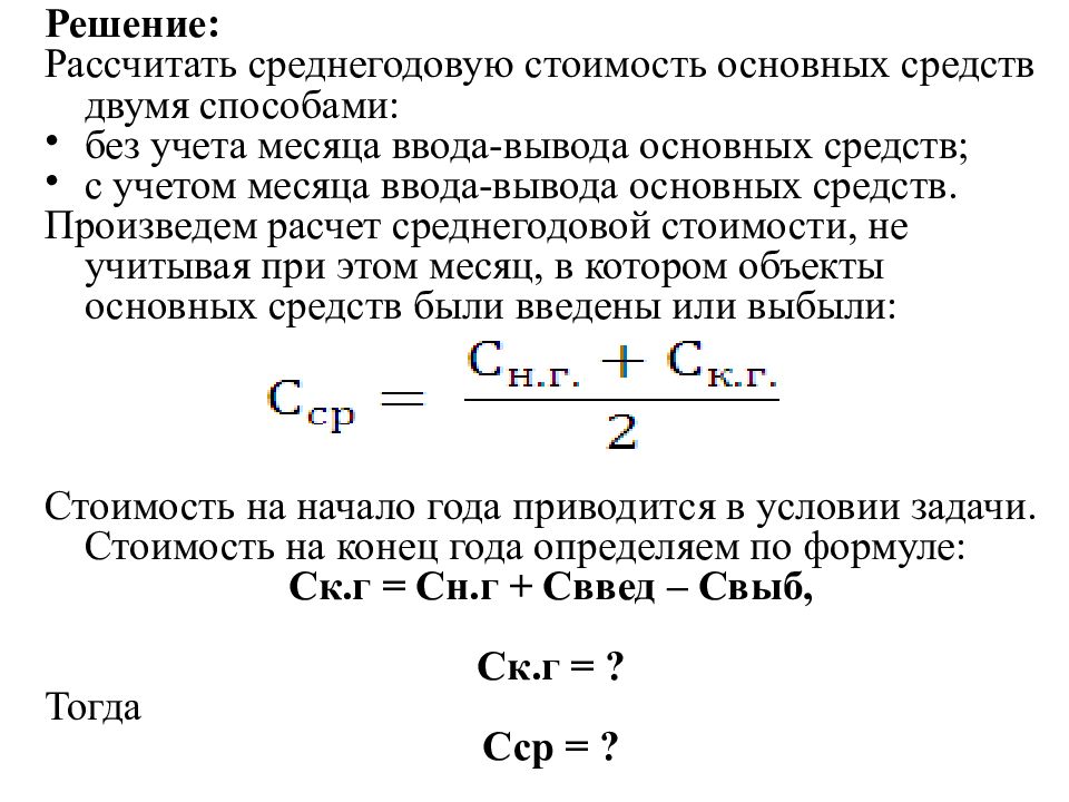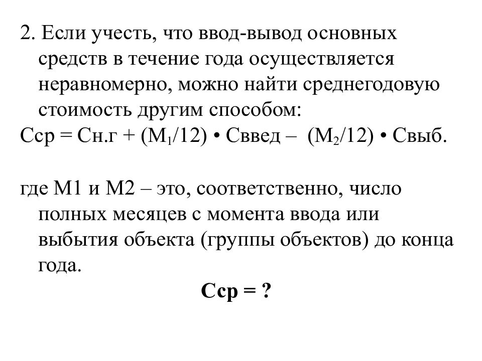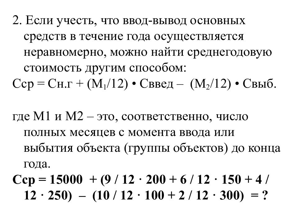 2. Если учесть, что ввод-вывод основных средств в течение года осуществляется неравномерно, можно найти среднегодовую стоимость другим способом: Сср = Сн.г + (М 1 /12) • Сввед – (М 2 /12) • Свыб. где М1 и М2 – это, соответственно, число полных месяцев с момента ввода или выбытия объекта (группы объектов) до конца года. Сср = ?