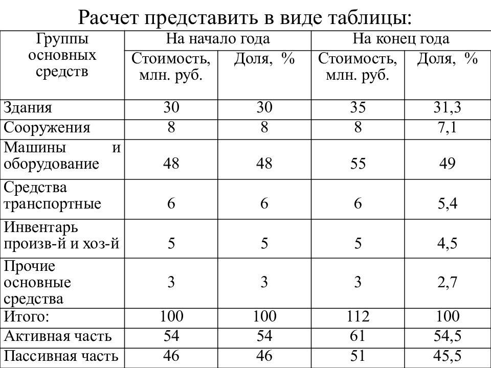 Группы основных средств На начало года На конец года Стоимость, млн. руб. Доля, % Стоимость, млн. руб. Доля, % Здания 30 30 35 31,3 Сооружения 8 8 8 7,1 Машины и оборудование 48 48 55 49 Средства транспортные 6 6 6 5,4 Инвентарь произв-й и хоз-й 5 5 5 4,5 Прочие основные средства 3 3 3 2,7 Итого: 100 100 112 100 Активная часть 54 54 61 54,5 Пассивная часть 46 46 51 45,5