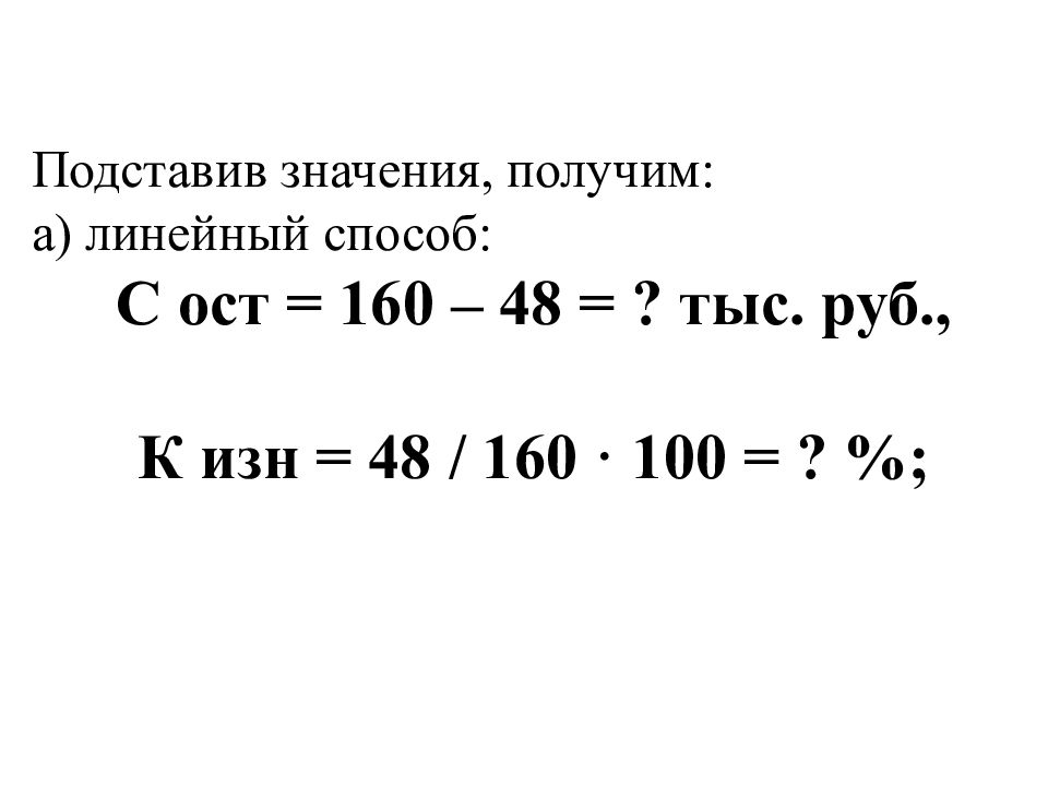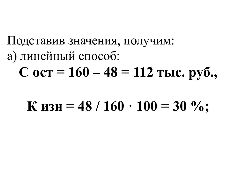 Подставив значения, получим: а) линейный способ: С ост = 160 – 48 = ? тыс. руб., К изн = 48 / 160 · 100 = ? %;