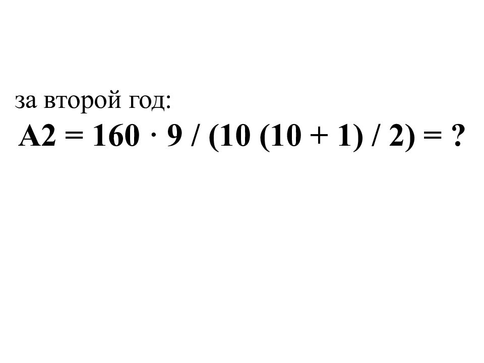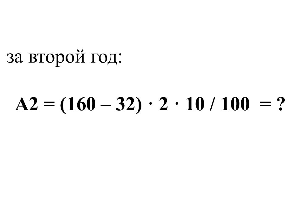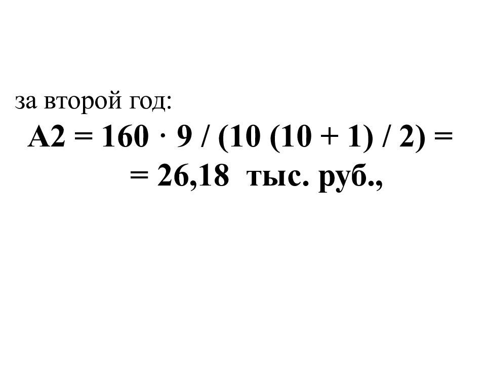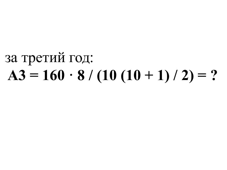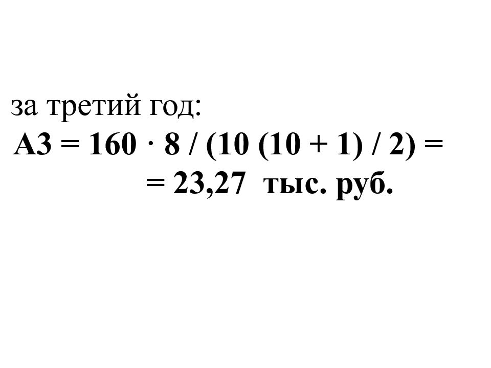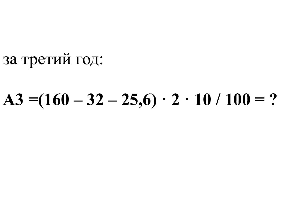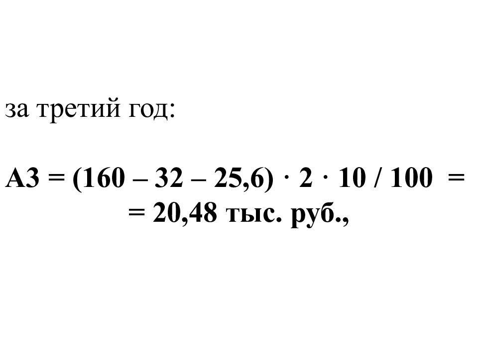 за третий год : А3 = (160 – 32 – 25,6) · 2 · 10 / 100 = = 20,48 тыс. руб.,
