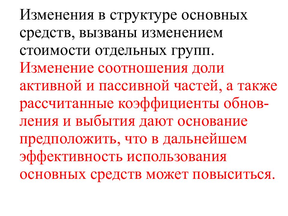 Изменения в структуре основных средств, вызваны изменением стоимости отдельных групп. Изменение соотношения доли активной и пассивной частей, а также рассчитанные коэффициенты обнов- ления и выбытия дают основание предположить, что в дальнейшем эффективность использования основных средств может повыситься.