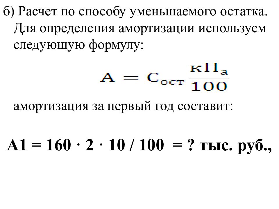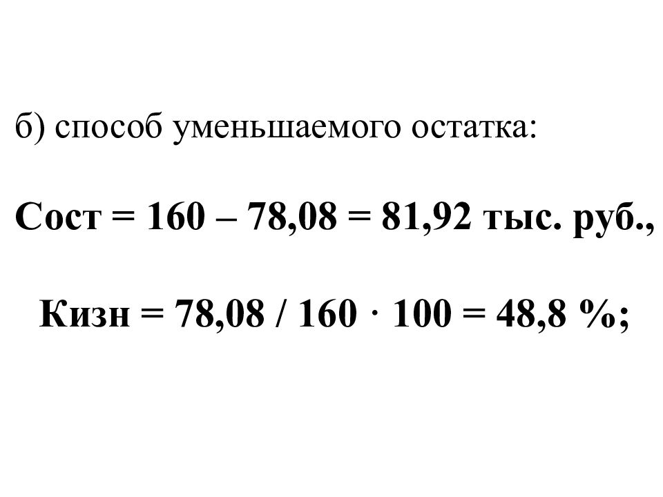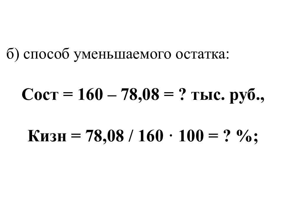 б) способ уменьшаемого остатка: Сост = 160 – 78,08 = ? тыс. руб., Кизн = 78,08 / 160 · 100 = ? %;