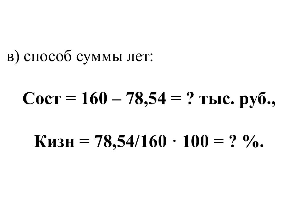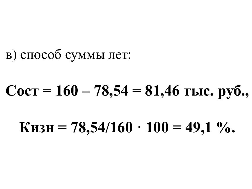 в) способ суммы лет: Сост = 160 – 78,54 = ? тыс. руб., Кизн = 78,54/160 · 100 = ? %.