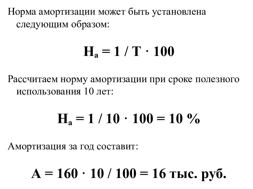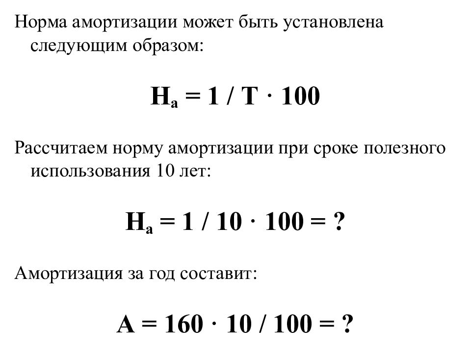 Норма амортизации может быть установлена следующим образом: Н а = 1 / Т · 100 Рассчитаем норму амортизации при сроке полезного использования 10 лет: Н а = 1 / 10 · 100 = ? Амортизация за год составит: А = 160 · 10 / 100 = ?