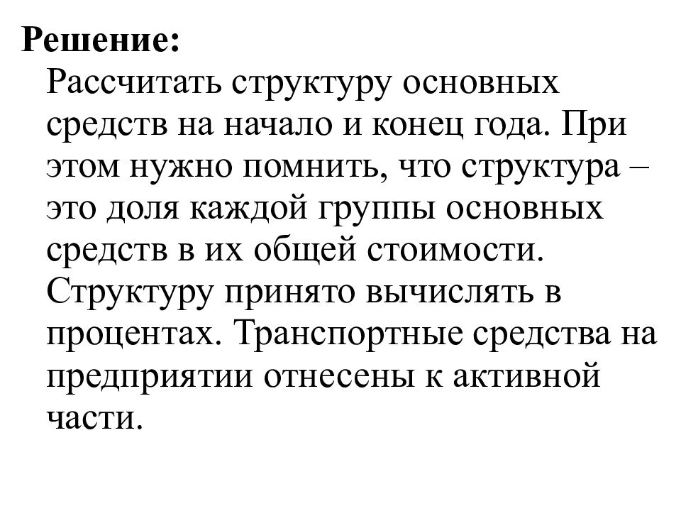 Решение: Рассчитать структуру основных средств на начало и конец года. При этом нужно помнить, что структура – это доля каждой группы основных средств в их общей стоимости. Структуру принято вычислять в процентах. Транспортные средства на предприятии отнесены к активной части.