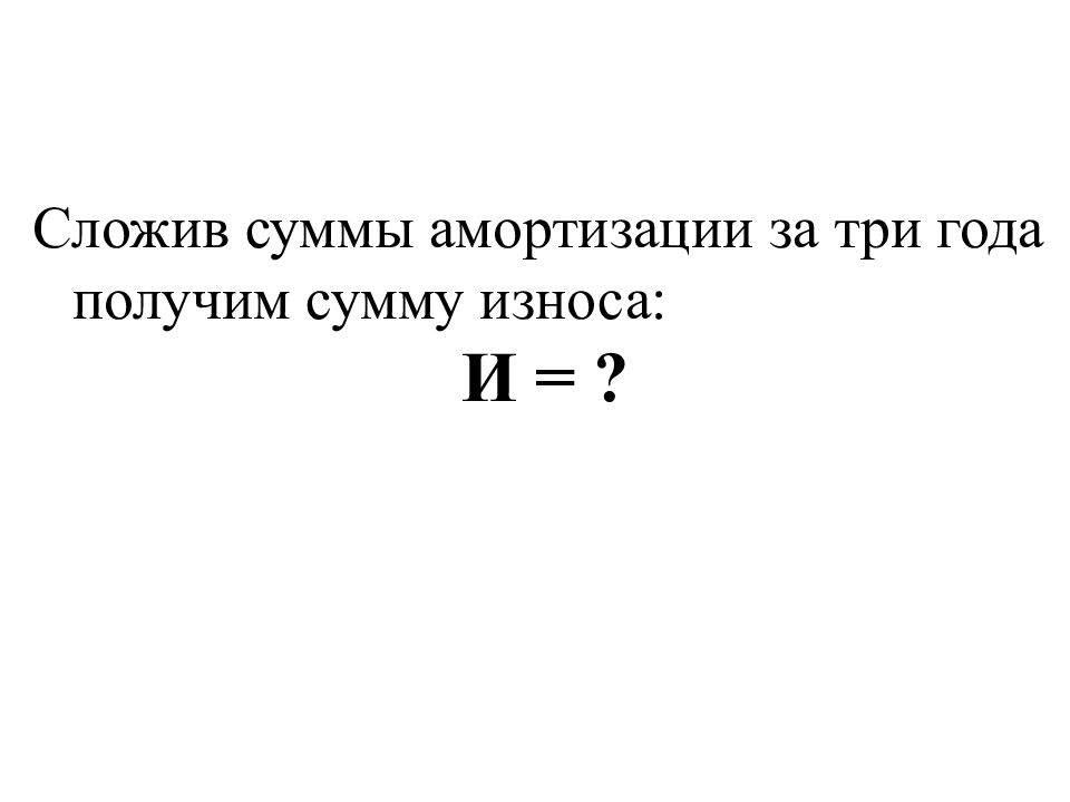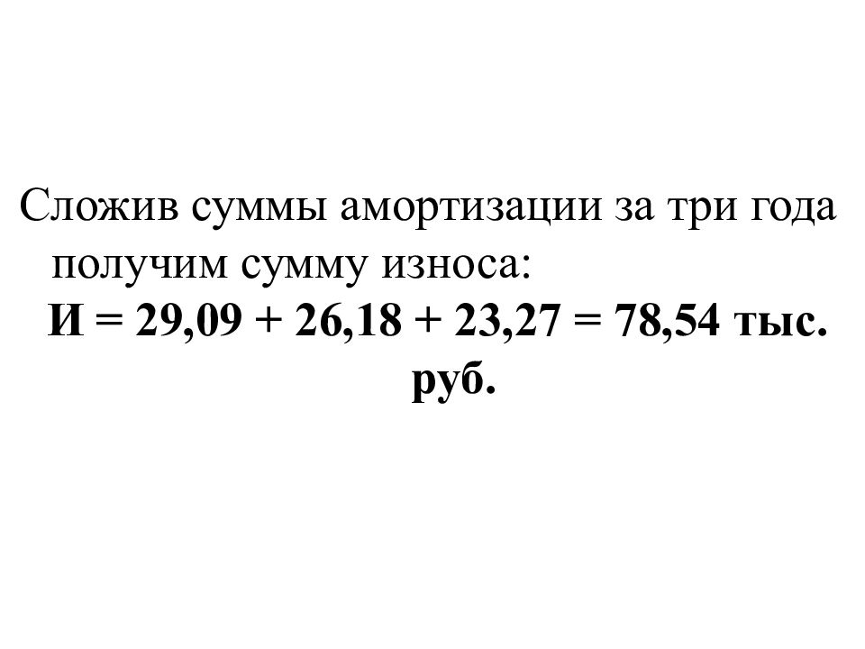 Сложив суммы амортизации за три года получим сумму износа: И = 29,09 + 26,18 + 23,27 = 78,54 тыс. руб.