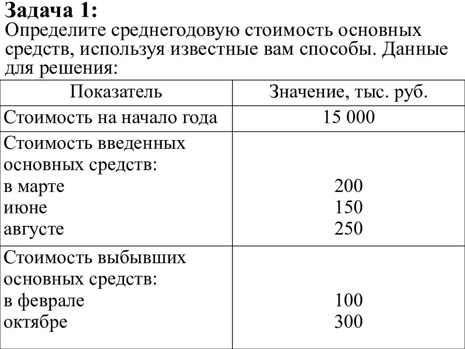 Показатель Значение, тыс. руб. Стоимость на начало года 15 000 Стоимость введенных основных средств: в марте июне августе 200 150 250 Стоимость выбывших основных средств: в феврале октябре 100 300