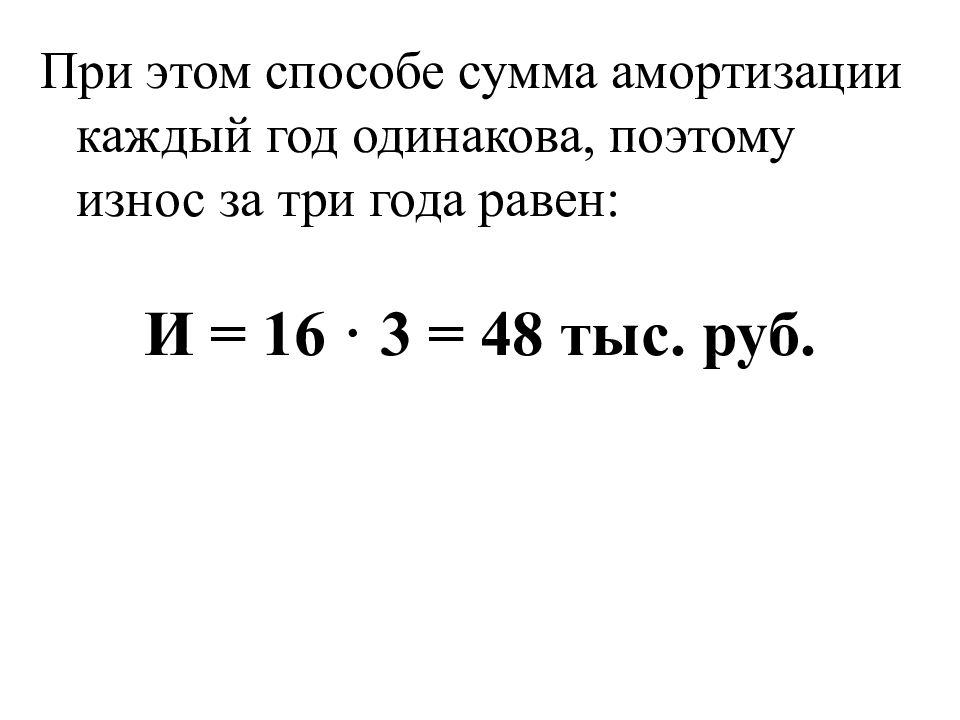 При этом способе сумма амортизации каждый год одинакова, поэтому износ за три года равен: И = 16 · 3 = 48 тыс. руб.