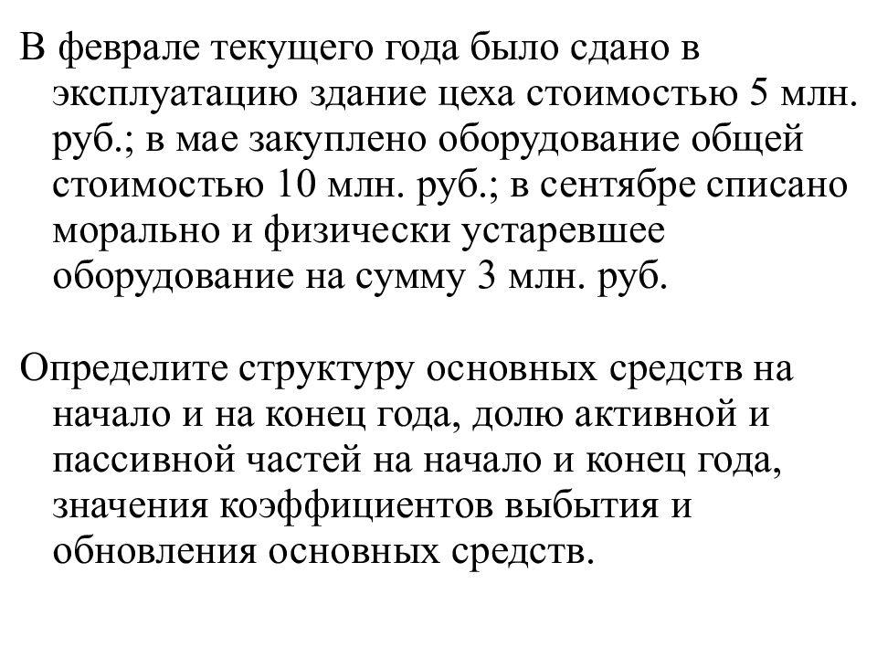 В феврале текущего года было сдано в эксплуатацию здание цеха стоимостью 5 млн. руб.; в мае закуплено оборудование общей стоимостью 10 млн. руб.; в сентябре списано морально и физически устаревшее оборудование на сумму 3 млн. руб. Определите структуру основных средств на начало и на конец года, долю активной и пассивной частей на начало и конец года, значения коэффициентов выбытия и обновления основных средств.