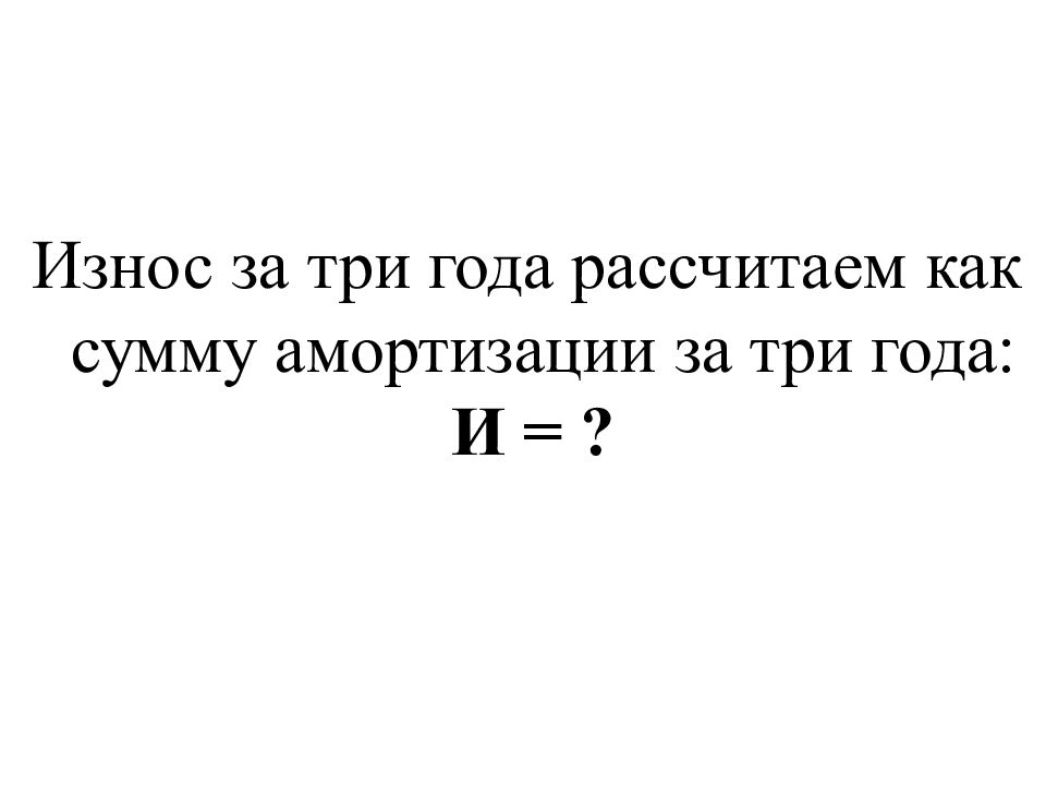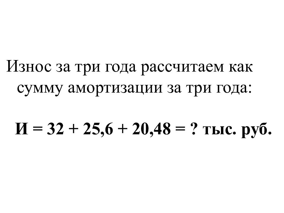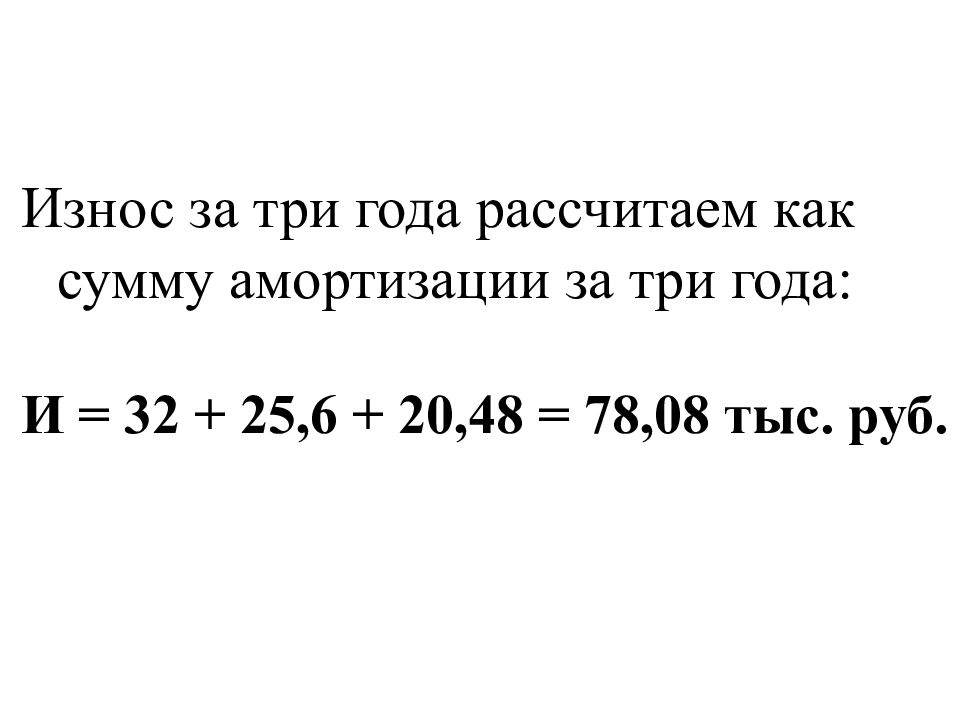 Износ за три года рассчитаем как сумму амортизации за три года: И = 32 + 25,6 + 20,48 = ? тыс. руб.