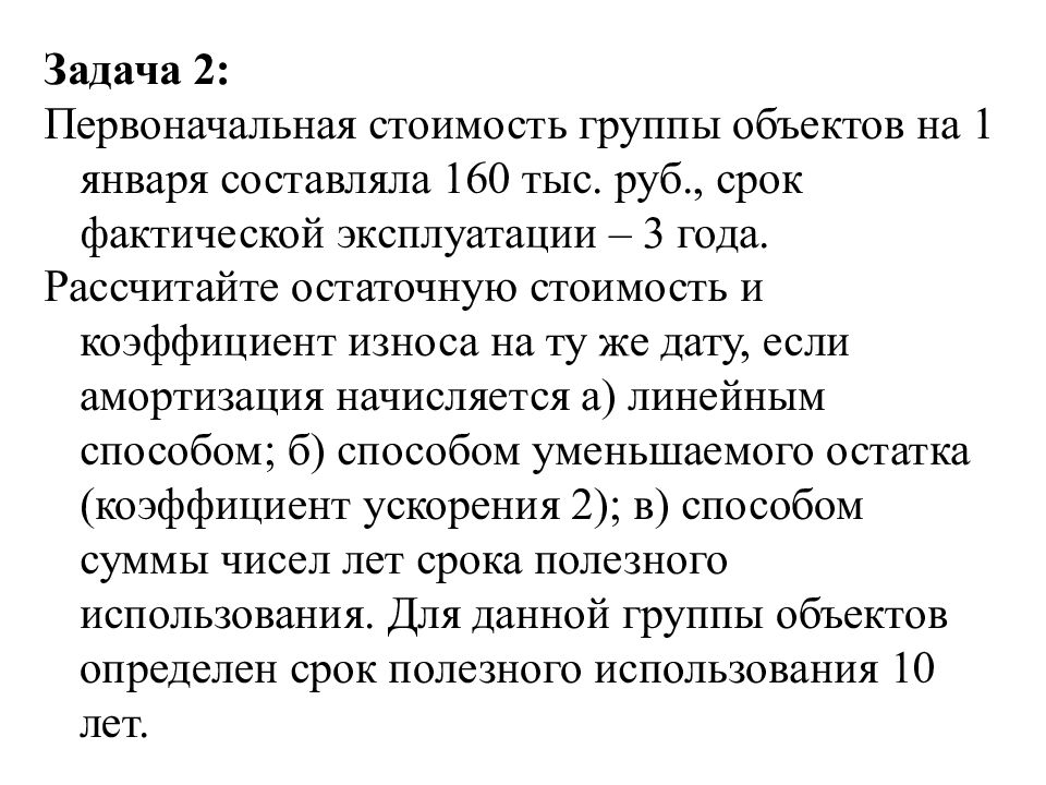 Задача 2: Первоначальная стоимость группы объектов на 1 января составляла 160 тыс. руб., срок фактической эксплуатации – 3 года. Рассчитайте остаточную стоимость и коэффициент износа на ту же дату, если амортизация начисляется а) линейным способом; б) способом уменьшаемого остатка (коэффициент ускорения 2); в) способом суммы чисел лет срока полезного использования. Для данной группы объектов определен срок полезного использования 10 лет.