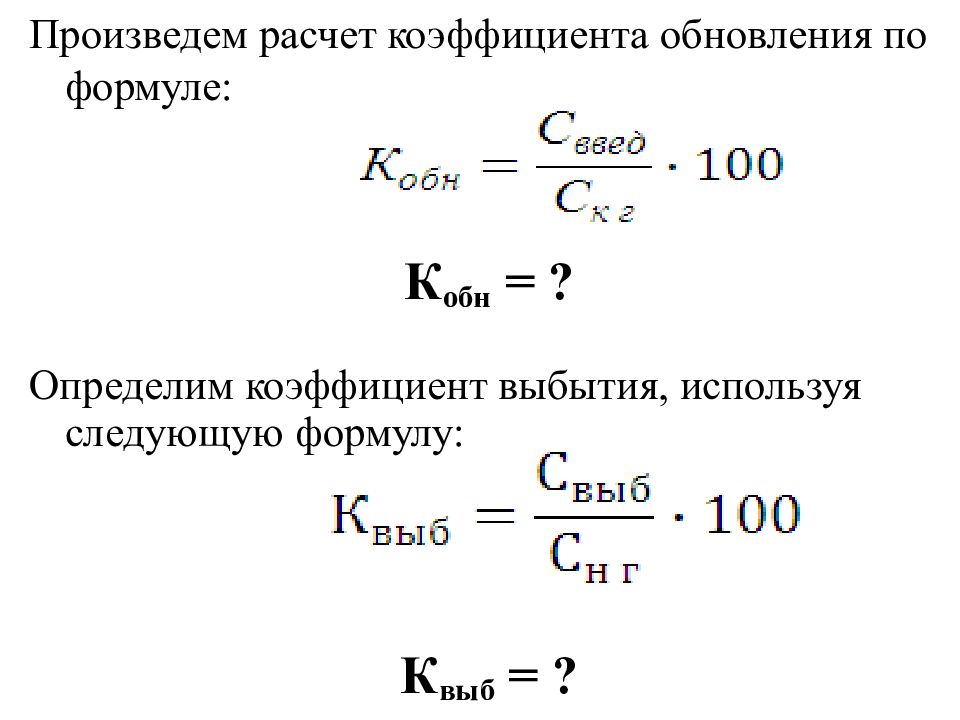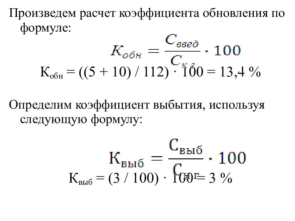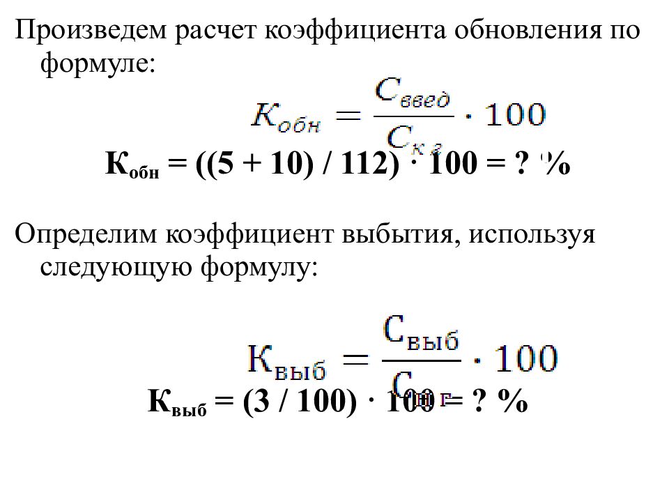 Произведем расчет коэффициента обновления по формуле: К обн = ((5 + 10) / 112) · 100 = ? % Определим коэффициент выбытия, используя следующую формулу: К выб = (3 / 100) · 100 = ? %