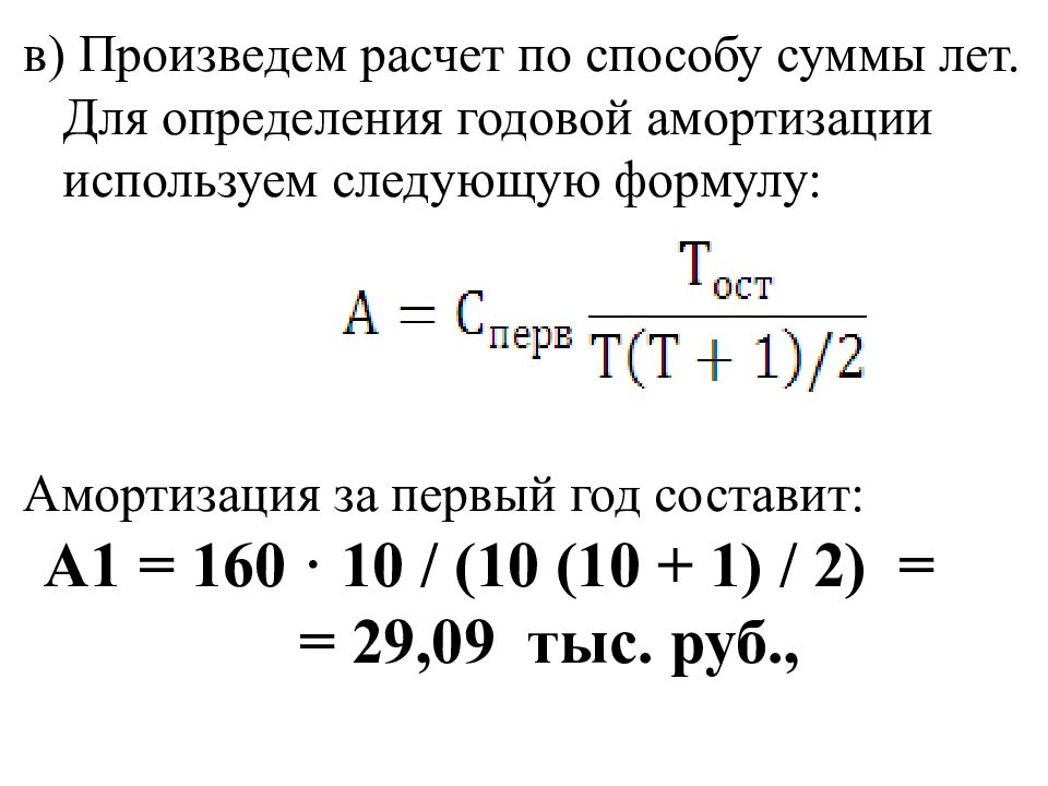 в) Произведем расчет по способу суммы лет. Для определения годовой амортизации используем следующую формулу: Амортизация за первый год составит: А1 = 160 · 10 / (10 (10 + 1) / 2) = = 29,09 тыс. руб.,