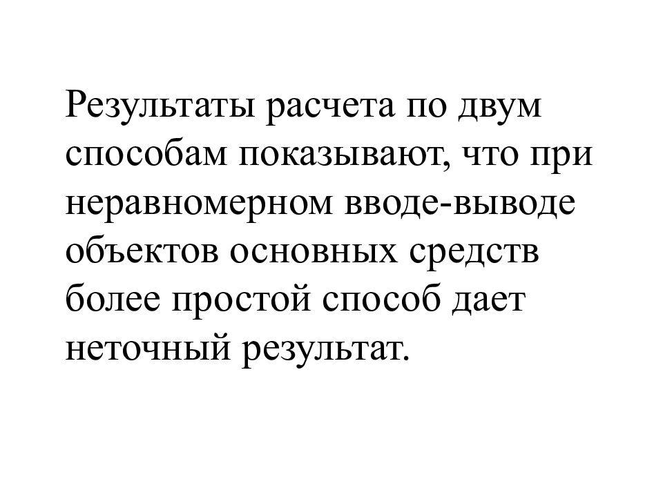 Результаты расчета по двум способам показывают, что при неравномерном вводе-выводе объектов основных средств более простой способ дает неточный результат.