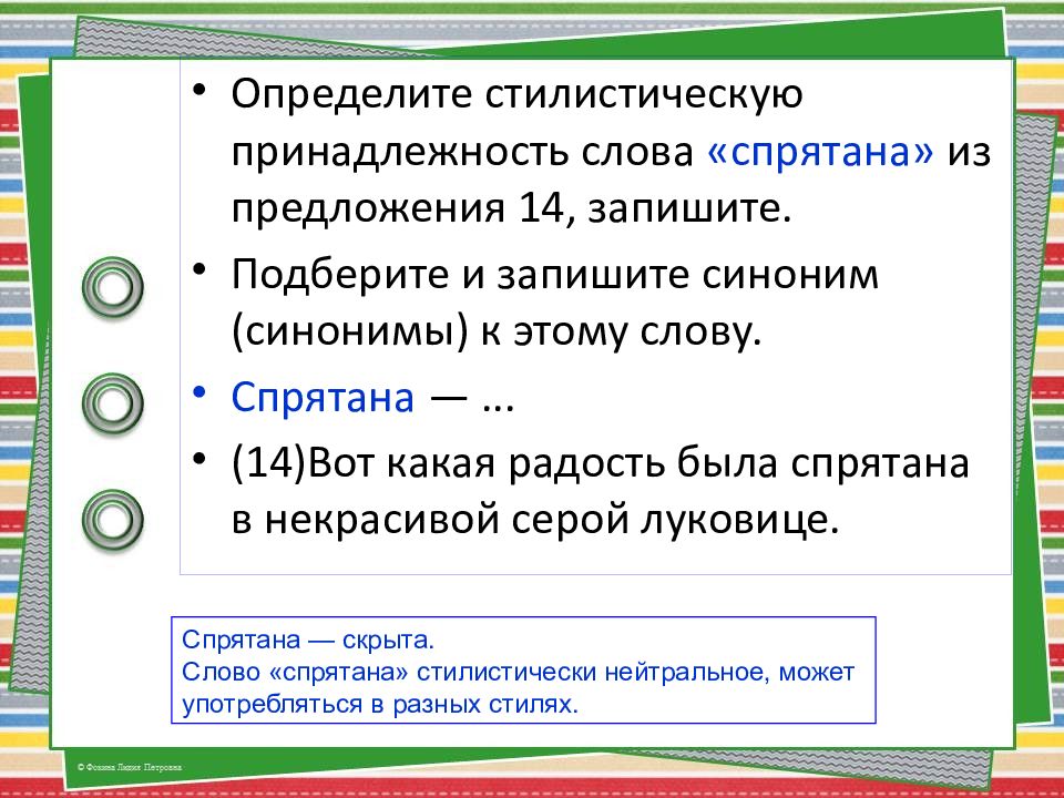 Определите стилистическую принадлежность слова «спрятана» из предложения 14, запишите. Подберите и запишите синоним (синонимы) к этому слову. Спрятана —... (14)Вот какая радость была спрятана в некрасивой серой луковице. Спрятана — скрыта. Слово «спрятана» стилистически нейтральное, может употребляться в разных стилях.