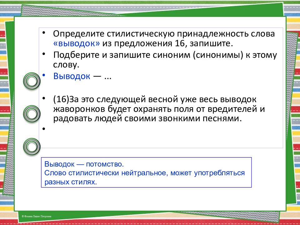 Определите стилистическую принадлежность слова «выводок» из предложения 16, запишите. Подберите и запишите синоним (синонимы) к этому слову. Выводок —... (16)За это следующей весной уже весь выводок жаворонков будет охранять поля от вредителей и радовать людей своими звонкими песнями. Выводок — потомство. Слово стилистически нейтральное, может употребляться разных стилях.