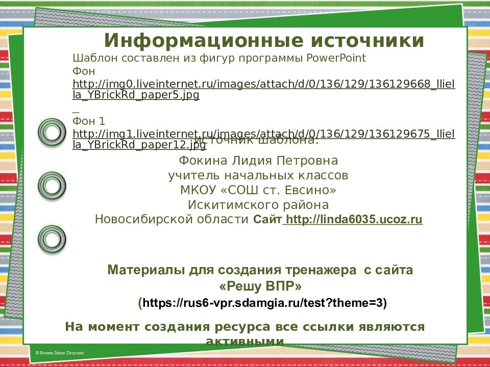 источник шаблона: Фокина Лидия Петровна учитель начальных классов МКОУ «СОШ ст. Евсино» Искитимского района Новосибирской области Сайт http://linda6035.ucoz.ru Материалы для создания тренажера с сайта «Решу ВПР» ( https://rus6-vpr.sdamgia.ru/test?theme=3) На момент создания ресурса все ссылки являются активными Информационные источники Шаблон составлен из фигур программы PowerPoint Фон http://img0.liveinternet.ru/images/attach/d/0/136/129/136129668_lliella_YBrickRd_paper5.jpg Фон 1 http://img1.liveinternet.ru/images/attach/d/0/136/129/136129675_lliella_YBrickRd_paper12.jpg