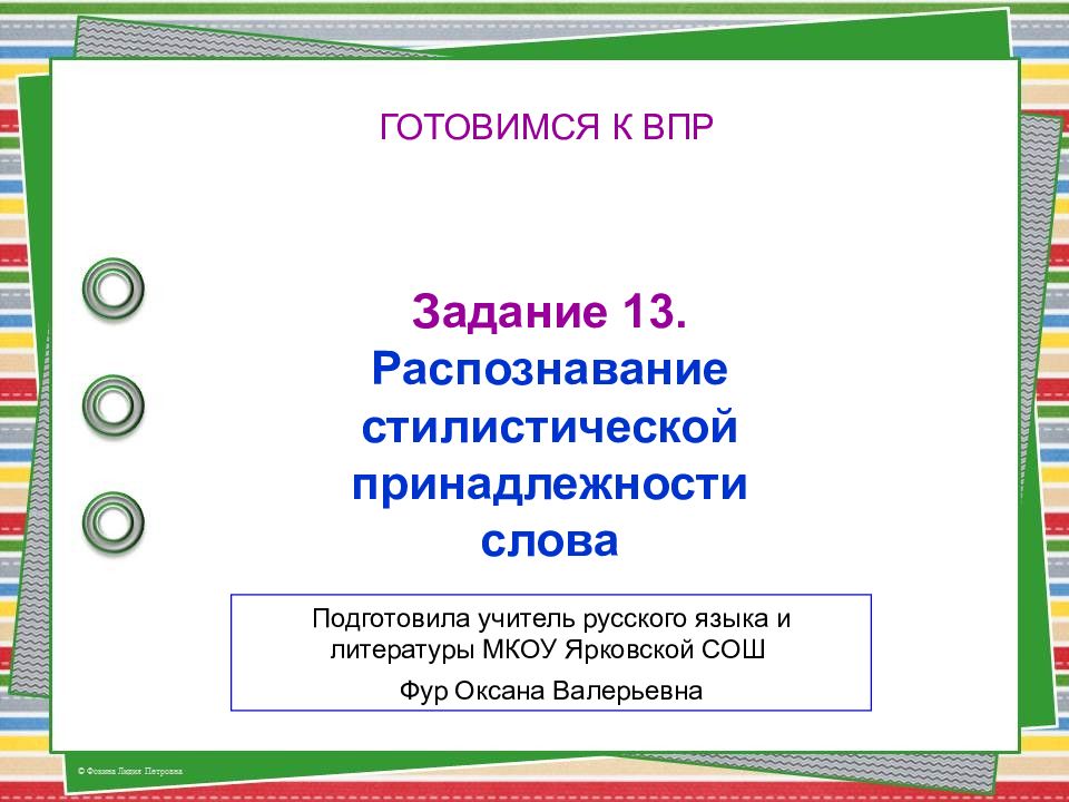 Задание 13. Распознавание стилистической принадлежности слова Подготовила учитель русского языка и литературы МКОУ Ярковской СОШ Фур Оксана Валерьевна ГОТОВИМСЯ К ВПР