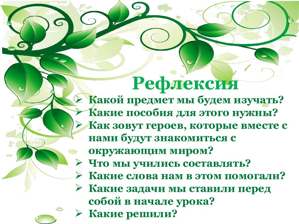 Рефлексия Какой предмет мы будем изучать? Какие пособия для этого нужны? Как зовут героев, которые вместе с нами будут знакомиться с окружающим миром? Что мы учились составлять? Какие слова нам в этом помогали? Какие задачи мы ставили перед собой в начале урока? Какие решили?