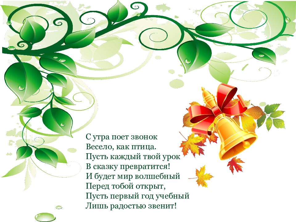 С утра поет звонок Весело, как птица. Пусть каждый твой урок В сказку превратится! И будет мир волшебный Перед тобой открыт, Пусть первый год учебный Лишь радостью звенит !