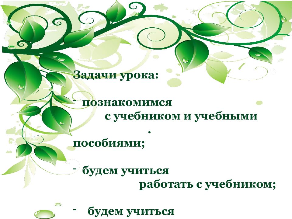 Задачи урока: п ознакомимся с учебником и учебными. пособиями; б удем учиться работать с учебником; будем учиться задавать вопросы.