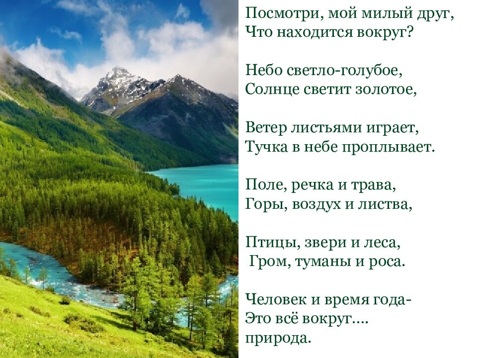 Посмотри, мой милый друг, Что находится вокруг? Небо светло-голубое, Солнце светит золотое, Ветер листьями играет, Тучка в небе проплывает. Поле, речка и трава, Горы, воздух и листва, Птицы, звери и леса, Гром, туманы и роса. Человек и время года- Э то всё вокруг …. природа.
