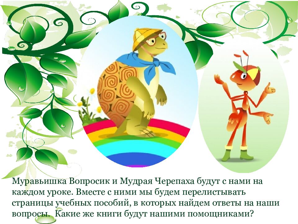 Муравьишка Вопросик и Мудрая Черепаха будут с нами на каждом уроке. Вместе с ними мы будем перелистывать страницы учебных пособий, в которых найдем ответы на наши вопросы. Какие же книги будут нашими помощниками?