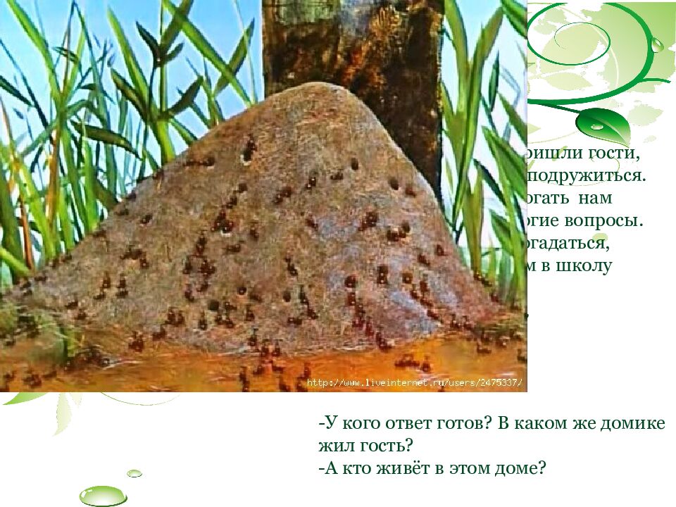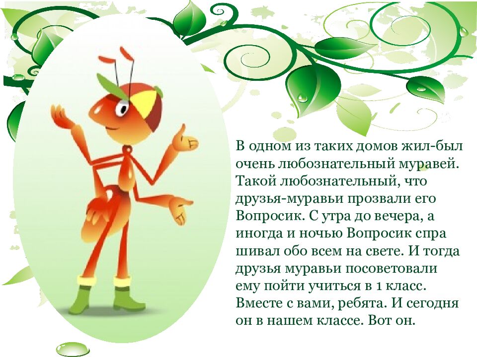 В одном из таких домов жил-был очень любознательный муравей. Такой любознательный, что друзья-муравьи прозвали его Вопросик. С утра до вечера, а иногда и ночью Вопросик спрашивал обо всем на свете. И тогда друзья муравьи посоветовали ему пойти учиться в 1 класс. Вместе с вами, ребята. И сегодня он в нашем классе. Вот он.