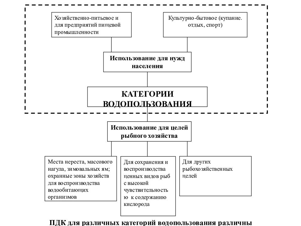 ПДК для различных категорий водопользования различны КАТЕГОРИИ ВОДОПОЛЬЗОВАНИЯ Использование для нужд населения Хозяйственно-питьевое и для предприятий пищевой промышленности Культурно-бытовое (купание. отдых, спорт) Использование для целей рыбного хозяйства Места нереста, массового нагула, зимовальных ям; охранные зоны хозяйств для воспроизводства водообитающих организмов Для сохранения и воспроизводства ценных видов рыб с высокой чувствительностью к содержанию кислорода Для других рыбохозяйственных целей