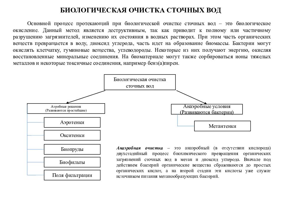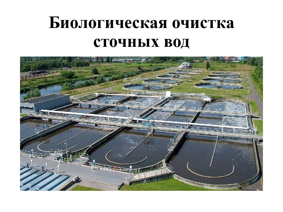 Биологическая очистка сточных вод Аэробные решения (Развиваются простейшие) Анаэробные условия (Развиваются бактерии) Аэротенки Окситенки Биопруды Биофильты Поля фильтрации Метантенки Основной процесс протекающий при биологической очистке сточных вод – это биологическое окисление. Данный метод является деструктивным, так как приводит к полному или частичному разрушению загрязнителей, изменению их состояния в водных растворах. При этом часть органических веществ превращается в воду, диоксид углерода, часть идет на образование биомассы. Бактерии могут окислять клетчатку, гуминовые вещества, углеводороды. Некоторые из них получают энергию, окисляя восстановленные минеральные соединения. На биоматериале могут также сорбироваться ионы тяжелых металлов и некоторые токсичные соединения, например бенз (а) пирен. Анаэробная очистка – это анаэробный (в отсутствии кислорода) двухстадийный процесс биохимического превращения органических загрязнений сточных вод в метан и диоксид углерода. Вначале под действием бактерий органические вещества сбраживаются до простых органических кислот, а на второй стадии эти кислоты уже служат источником питания метанообразующих бактерий. БИОЛОГИЧЕСКАЯ ОЧИСТКА СТОЧНЫХ ВОД